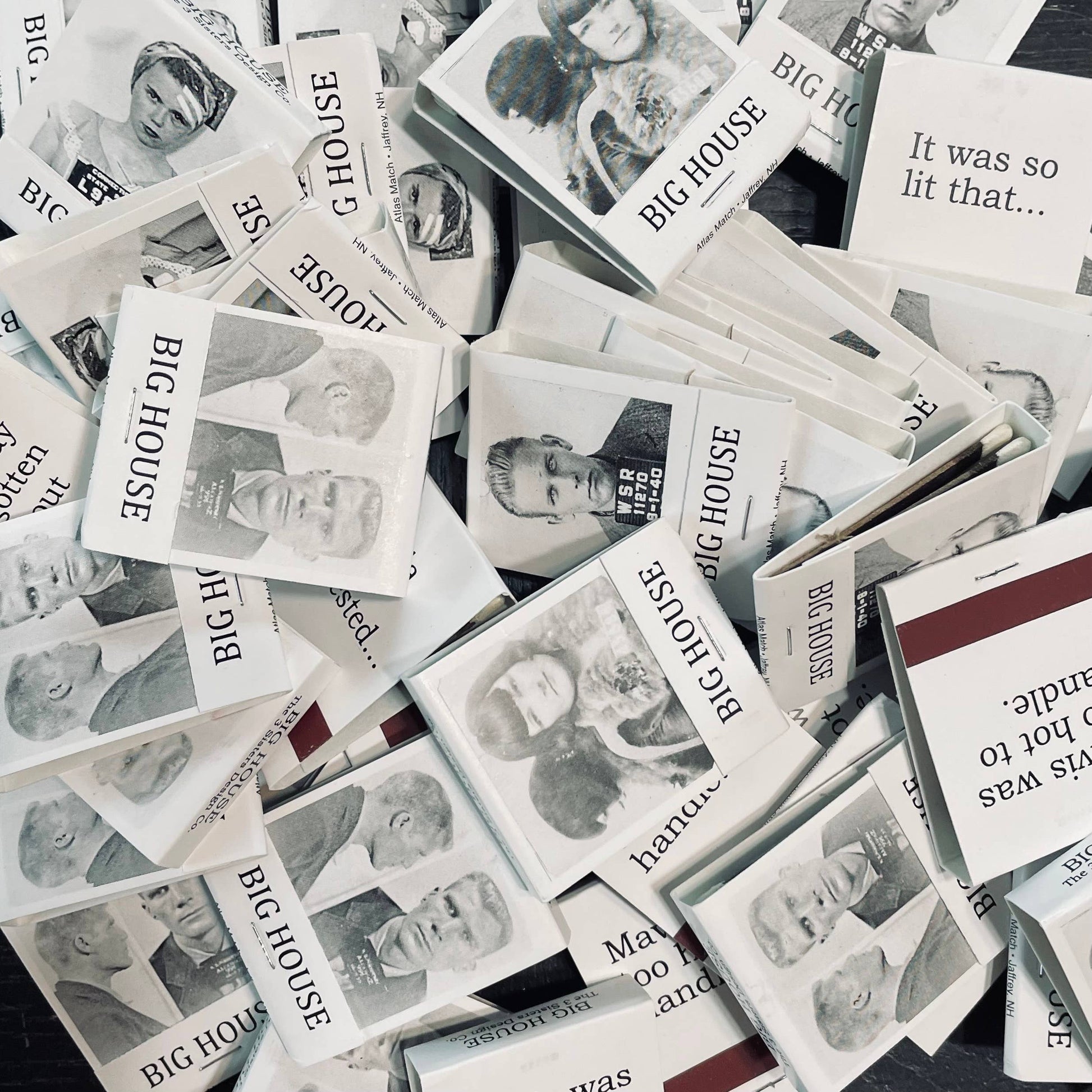 Another BIG HOUSE product! Matchbooks, packages of 50 pieces. Vintage mug shot on the front and saying on the back. This is for a box of 50 identical images. New pictures to follow once I get a chance to shoot them! But picture on the front, saying on the back.