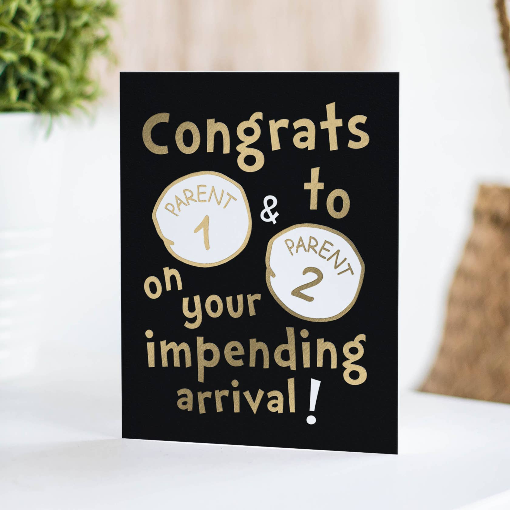 All of our baby announcements are folded A2 (4.25 x 5.50") in size, are offset printed with gold foil on 100 lb. cover and come with coordinating grey euro flap envelopes. All of our cards come with blank white interiors and are packaged in clear cellophane sleeves.