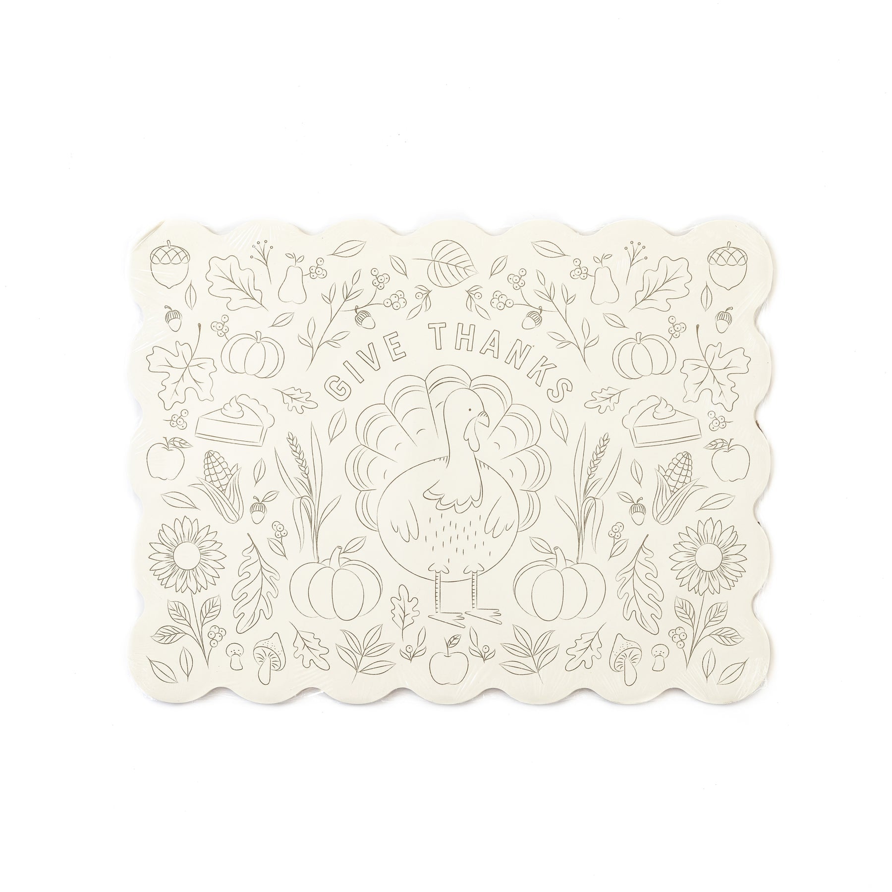 Make the kids' table the place to be with these festive coloring placemats. Featuring a whimsical turkey and festive sentiment "give thanks" these placemats are sure to be a favorite focal point of your Thanksgiving table for your loved ones both young and old!